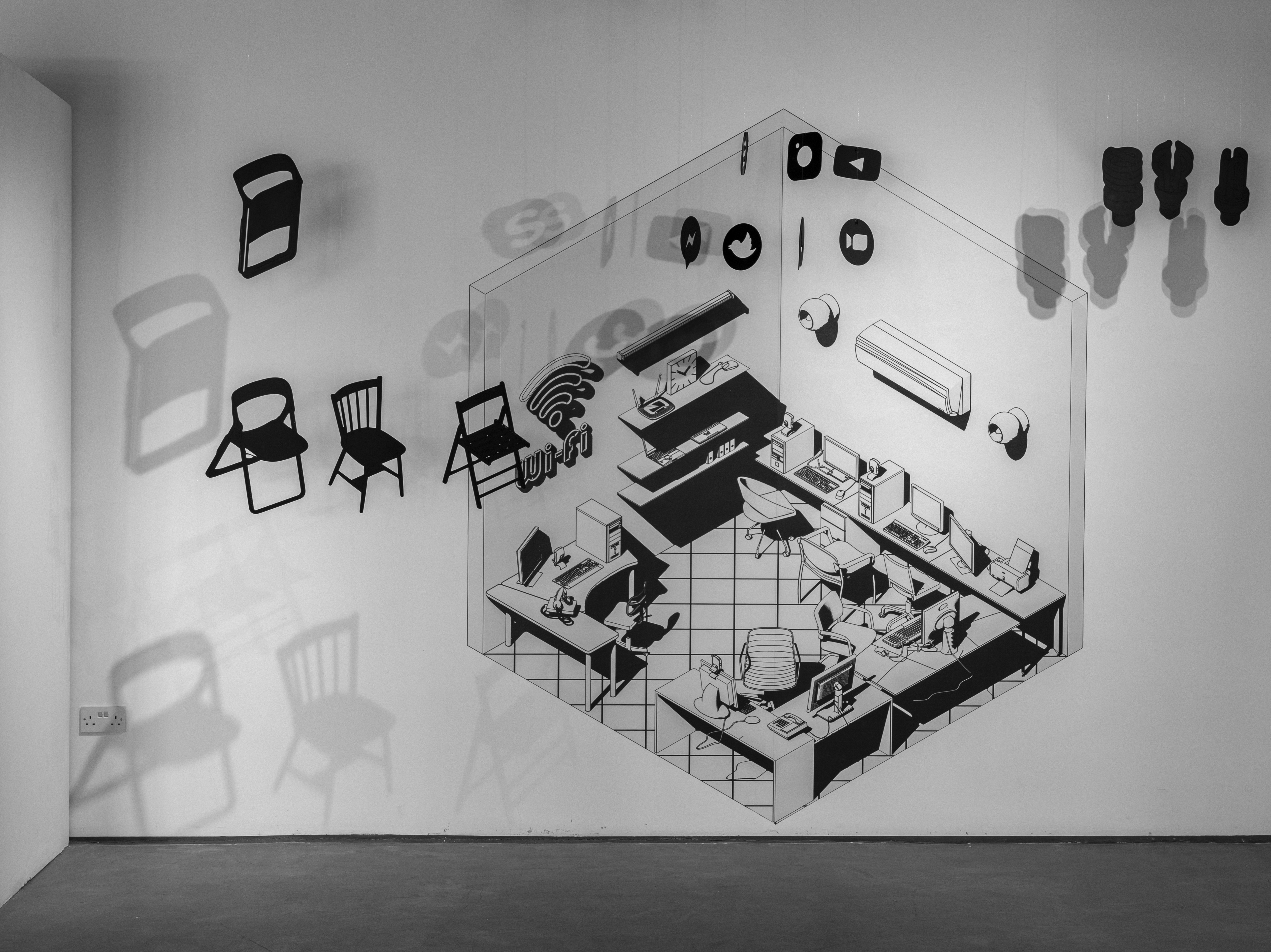 “End Meeting For All" is a physical space for virtual conversations, a hybrid between an office space and an internet cafe. The main elements that make up this cyber room are office furniture, computer devices, and a high-speed internet connection. The seating arrangement is rather peripheral and faces outwards. No physical interaction is supposed to take place between the people in this room!
