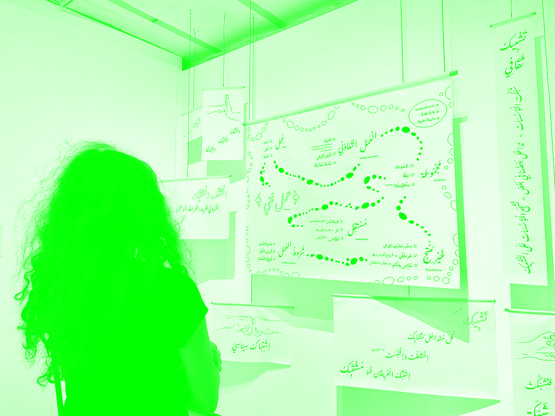 Machi Mashy was exhibitied as part of “But these forms need to be created”. This articulation included a selection of terms related to individuals who engage in collaborative art practices. Departing from “Art-Work”, words in Classical Arabic are dissected then their derivatives are reexamined through three dialects; Moroccan, Egyptian, Palestanian. Parallel to this, Mohamed Abdelkarim reflects on the linguistic perceptions between “The Institution” and “The Intellectual” in the political/cultural field.