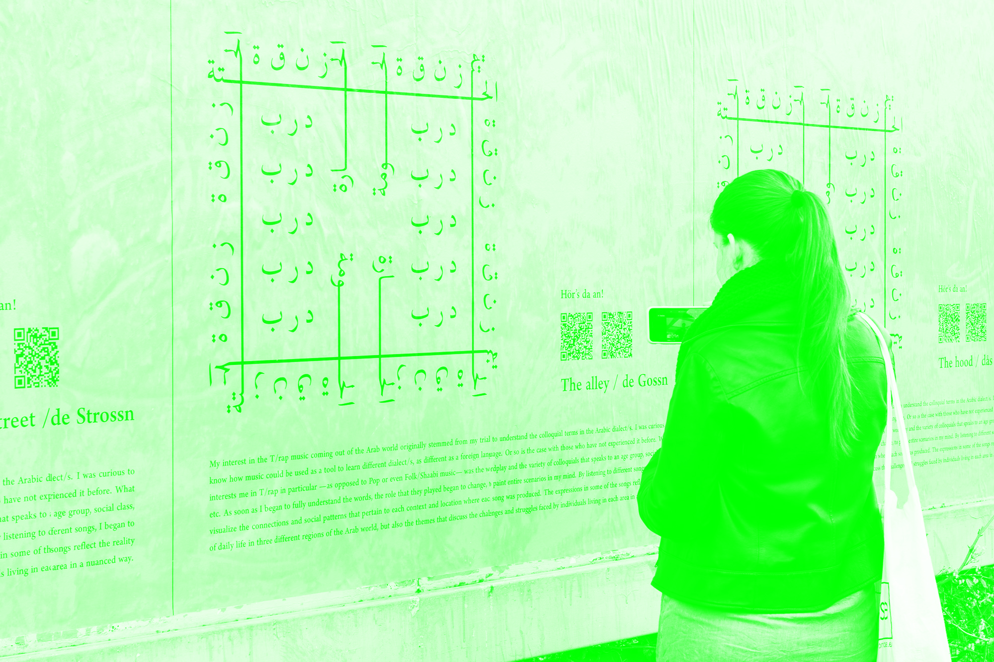 تم عرض الجزء الثاني من مشروع «ماشي ماشي» في معرض «الأشتياق إلى مجتمع»، وهو معرض من جزئين عبر الإنترنت وعلى جدران مساحة «فلوك» في فيينا، حيث تطرح العديد من الأعمال مساحة للتفكير في لغة مشتركة وأشكال العمل الجماعي. بسبب اهتمامنا المشترك بموسيقى التراب الصادرة من شمال إفريقيا والشام، قمنا بإستكشاف لغة الشارع من بعض هذه التراكات.ا