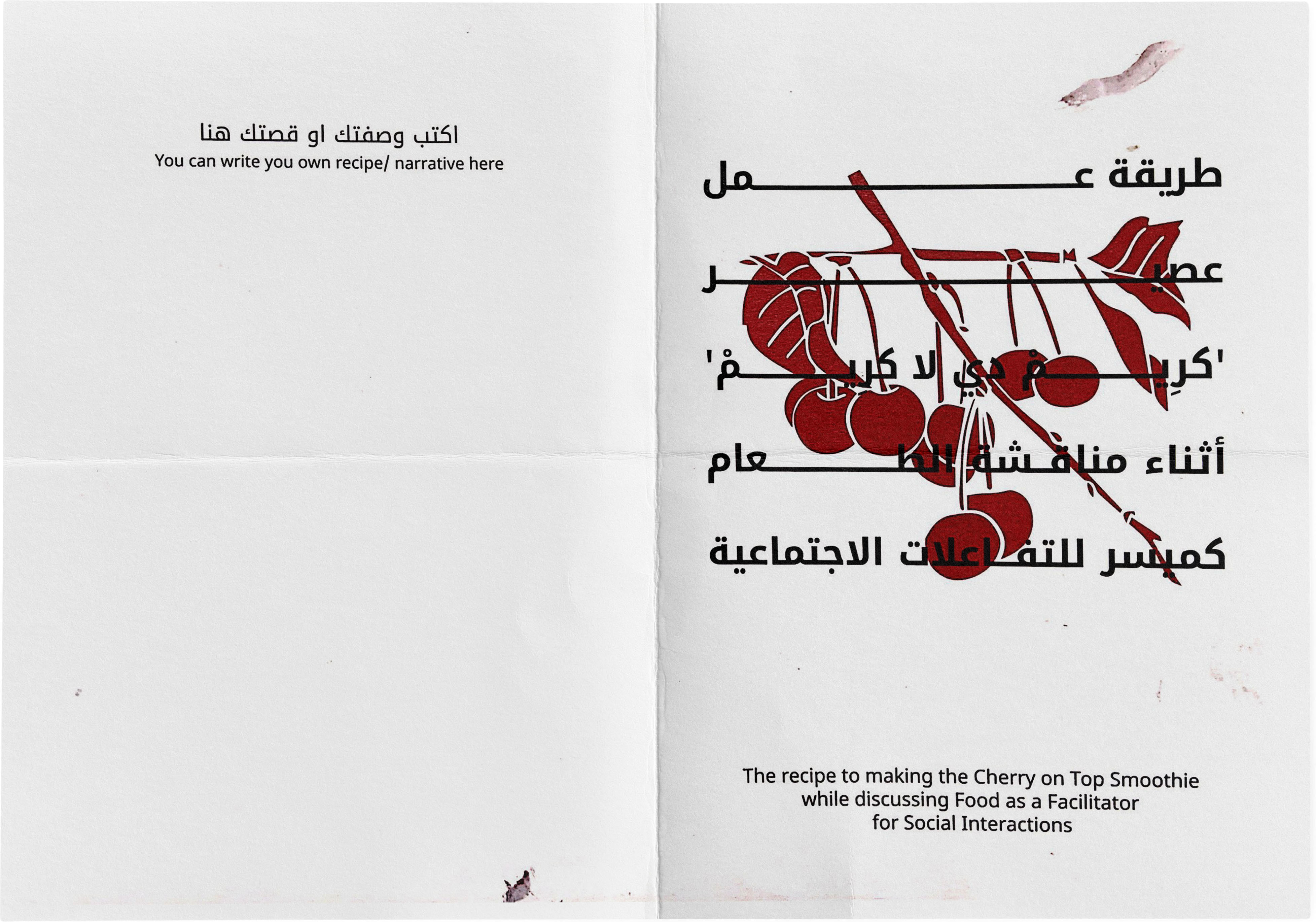 a conversation by posing questions to the bigger group. The bigger group was seated at the big table, having a conversation. The duo, in a self-choreographed performance, took turns choosing a smoothie from a collection of five recipes; their small table acted as a stage. There were recipes for a mango smoothie, a watermelon smoothie, a banana smoothie, a kiwi smoothie, and a cherry smoothie. The recipes came with a list of curated ingredients, and a list of questions. The questions accompanying the recipes asked about food production and consumption, as well as eating habits and our relationship with food. The cutting, peeling, and blending of the ingredients ended with us tasting the prepared smoothie together.